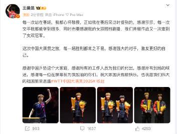 王曼昱的这条微博简直道出了运动员的心路历程。她特别感谢了孙颖莎,称每次交手都能学到很多——这不就是顶尖运动员的格局吗?既是对手,更是互相成就的伙伴。还有她和蒯曼的女双组合,又一次捧起冠军奖杯,这份默契可不是一朝一夕能练就的。