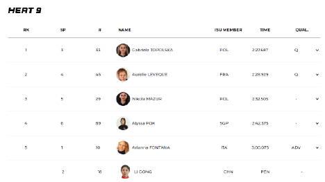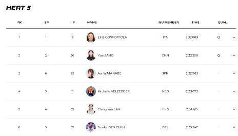 先说说这场激动人心的比赛。杨婧茹在第一组出场就稳扎稳打,2分32秒582的成绩让她轻松拿下小组第二。更绝的是第五组的臧一泽,这姑娘滑出了2分32秒250,像支离弦的箭一样冲过终点。可惜公俐在比赛中和方塔纳发生碰撞,虽然看得人心惊肉跳,但裁判最终判了她犯规。竞技体育就是这么残酷,但中国姑娘们的拼搏精神真的让人respect!
