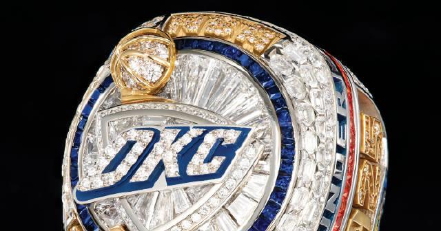 💡这枚戒指最特别的是采用了’戒中戒’设计。主戒用14K白金和黄金打造,中间镶嵌着深邃的蓝宝石。顶部刻着’NBA CHAMPIONS’字样和奥布莱恩杯图案,仔细数数,上面竟然有超过800颗手工镶嵌的宝石!