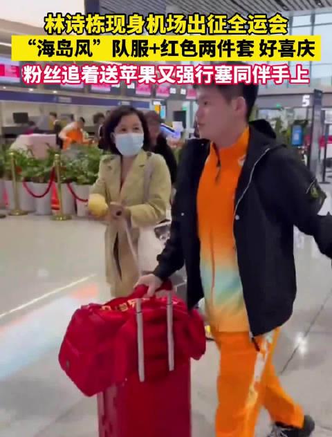 林诗栋全运会出征造型吸睛,橙色海岛风队服搭配红色行李箱超喜庆