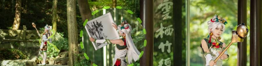 说真的,这组片子拍得太有灵性了。Coser缪喵和摄影@-到点儿生气- 为了还原‘守护者的奉献’这个皮肤,干的事儿可太‘真人’了。不是那种租个棚、摆几个姿势就完事的套路。她们是真的跑去爬山找竹林踩点,就为了背景里那几缕透过竹叶的光。更绝的是,为了拍拉克丝咬竹子的那个画面,她们居然专门养了一瓶富贵竹!